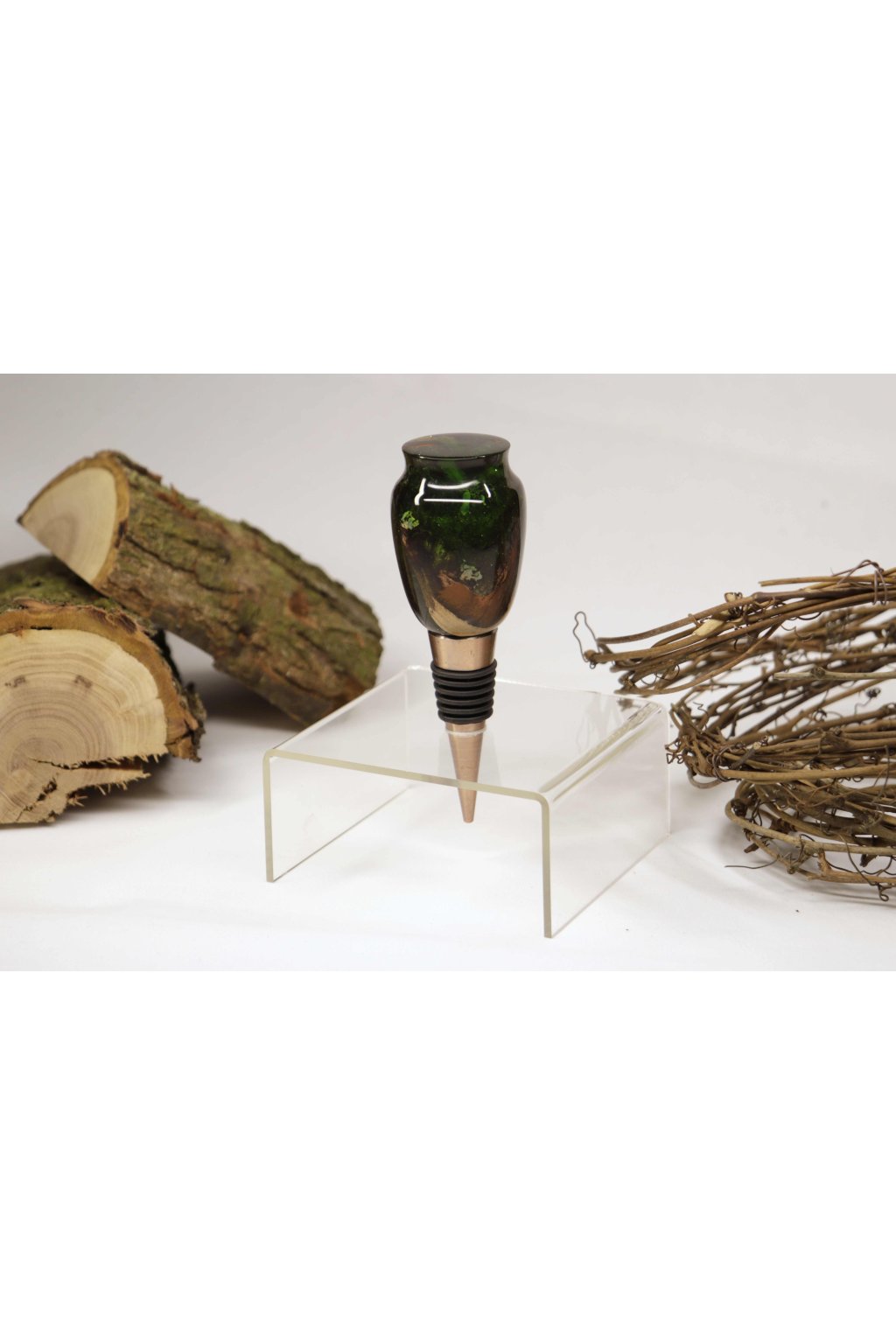 Zátka na víno ZVP006 Ořechové dřevo s kůrou a mechem a pryskyřice