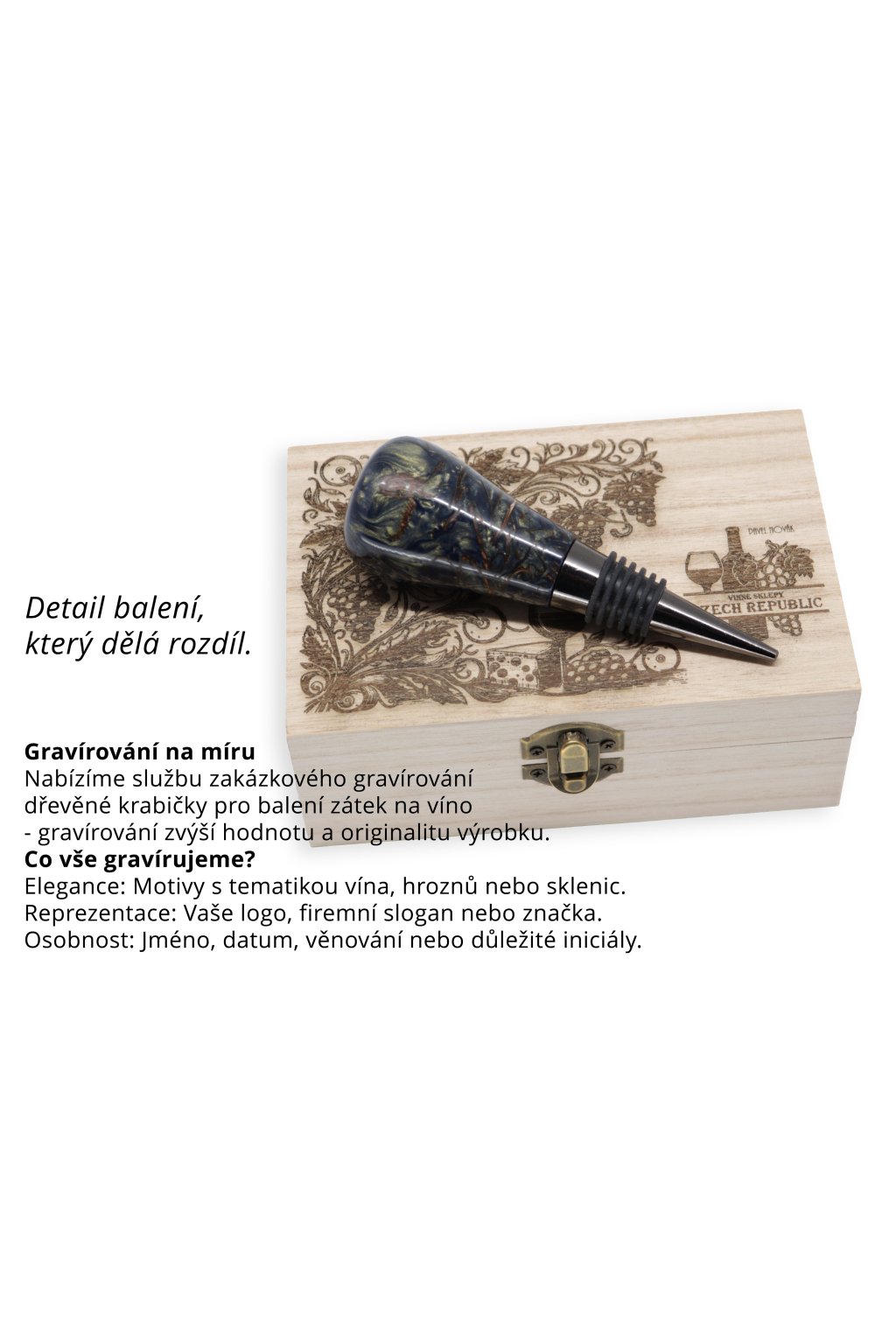 Balení: a) v základní ceně v kartonové krabičce s průzorem, b) za příplatek v dřevěné krabičce s motivem vína, c) za příplatek v dřevěné krabičce s motivem vína + gravírováním přání nebo loga