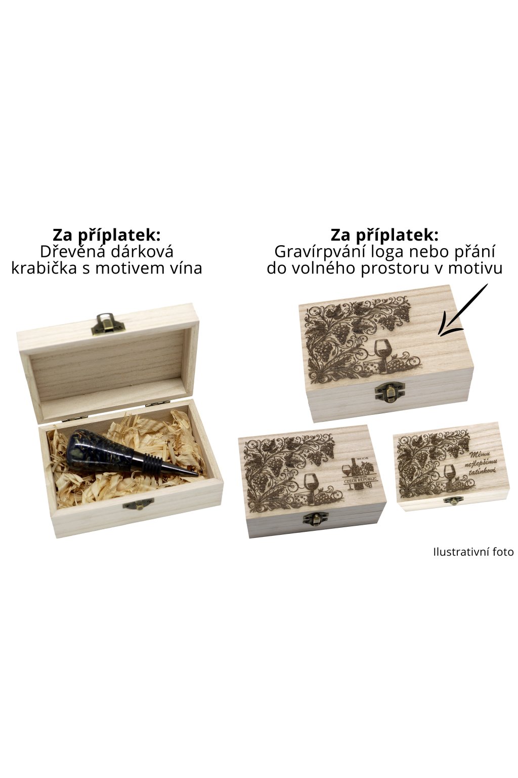 Balení: a) v základní ceně v kartonové krabičce s průzorem, b) za příplatek v dřevěné krabičce s motivem vína, c) za příplatek v dřevěné krabičce s motivem vína + gravírováním přání nebo loga